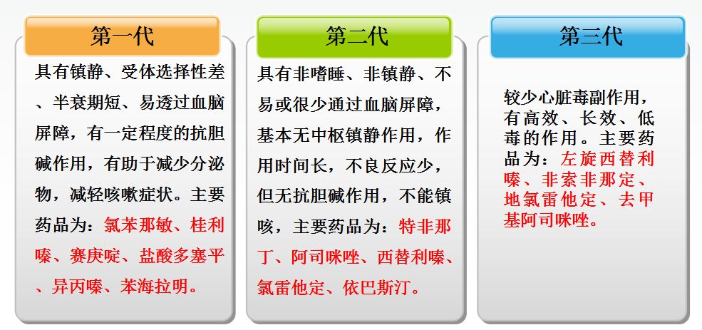 主要作用:该类药物具有抗过敏作用,通过阻断组胺受体,抑制小血管扩张,减低血管通透性,有助于消除或减轻普通感冒患者打喷嚏、流鼻涕等症状。抗组胺药分为三代,每一代的作用特点及主要药物如下: