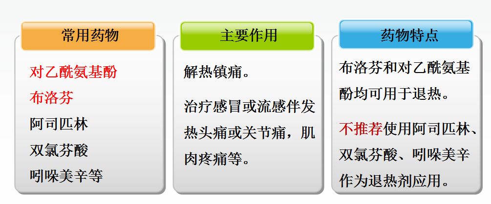 可缓解感冒者的发热、头痛、肌肉痛、关节痛等症状,也可以抑制炎症反应。常用药物是对乙酰氨基酚和布洛芬。