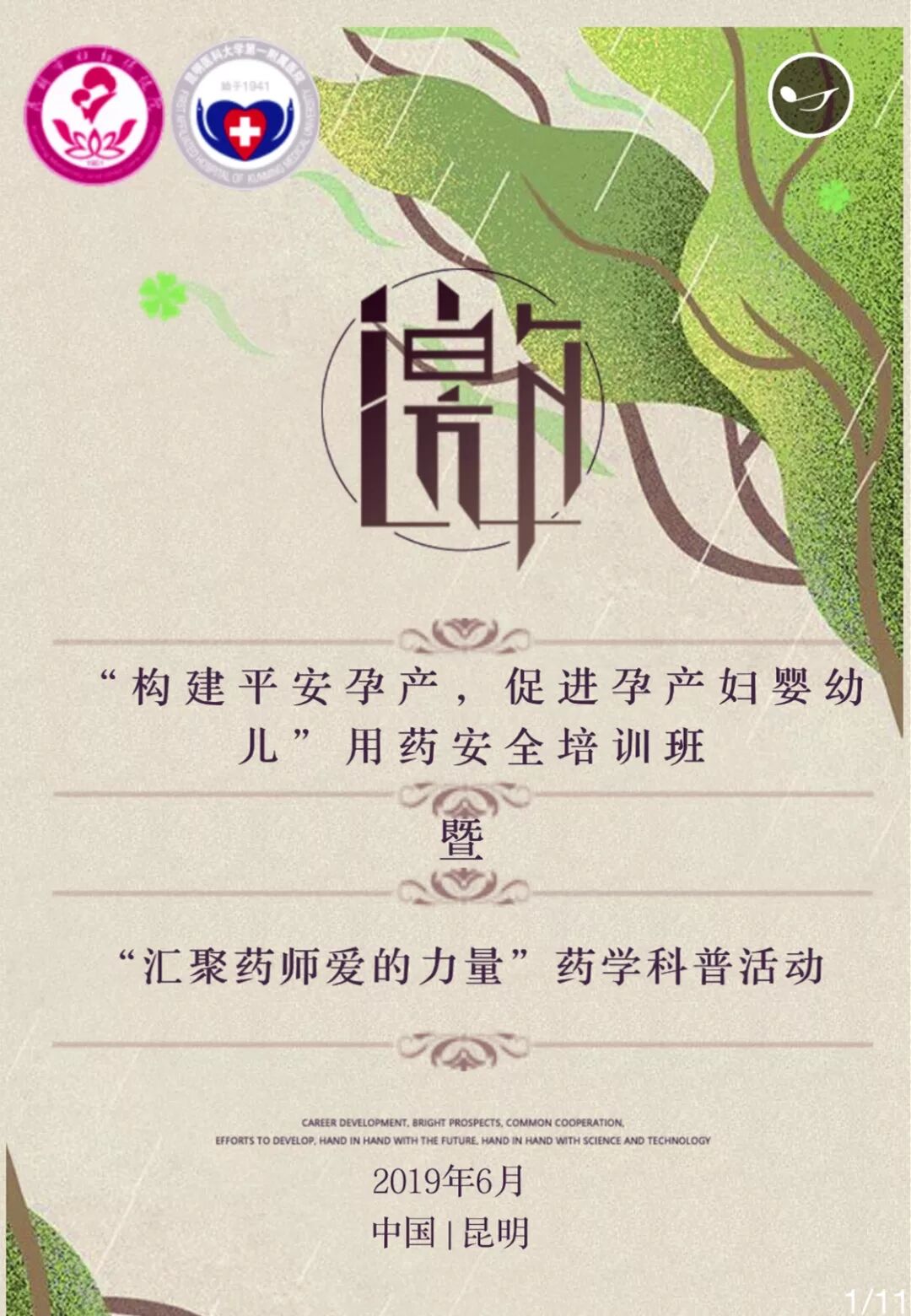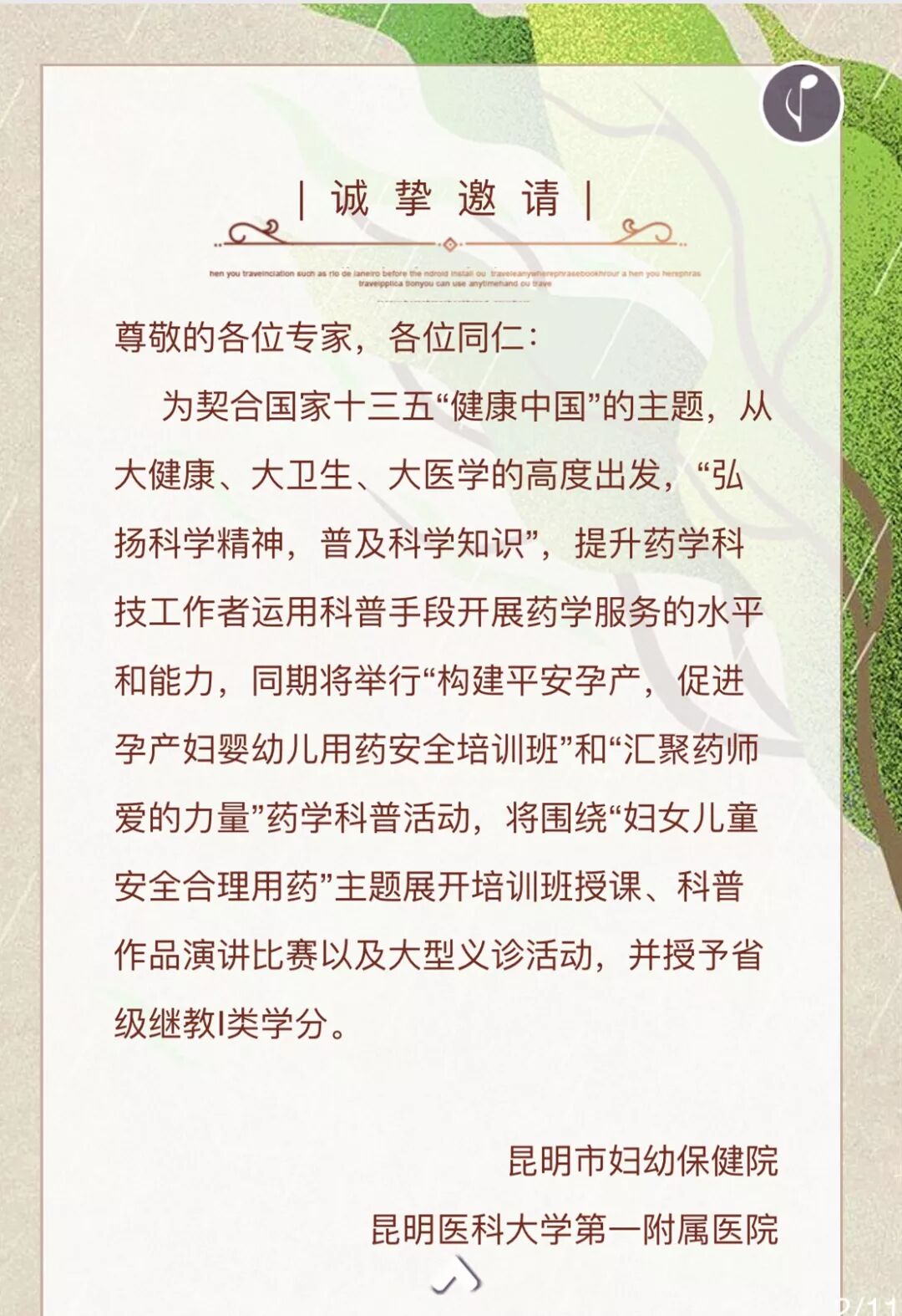 为“弘扬科学精神,普及科学知识”,提升药学科技工作者运用科普手段开展药学服务的水平和能力,向公众广泛宣传安全合理用药常识,昆明市妇幼保健院及昆明医科大学第一附属医院临床药学科共同承办的“汇聚药师爱的力量”药学科普活动,将于2019年6月21日~25日,在翠湖南路112号海鸥宾馆围绕“妇女儿童安全合理用药”主题展开。(昆明市妇幼保健院 供稿)