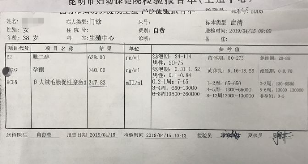经过了13天漫长而又幸福的等待,4月15日于女士怀着忐忑的心情到中心验孕,HCG示:247.83mIU/ml,确认妊娠。