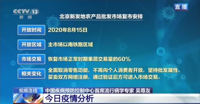 北京新发地市场于8月15日复市,全面取消零售功能,不再向个人消费者开放。吴尊友认为,采取这个措施很有必要,不再进行零售,减少了人流量,也降低了呼吸道传染病以及其他传染病流行的风险。