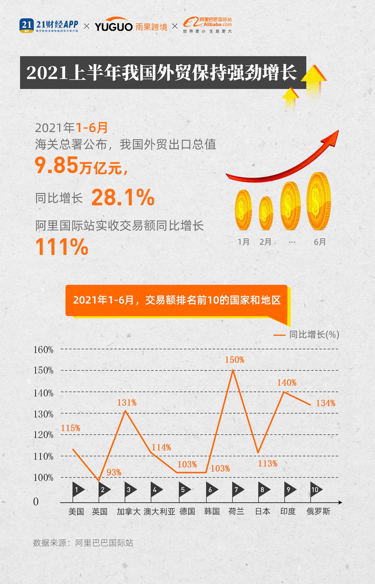 跨境电商B2B平台阿里国际站也发布了最新一期的“新外贸指数”,显示今年上半年该平台交易额同比增长111%。