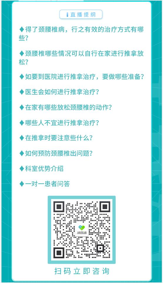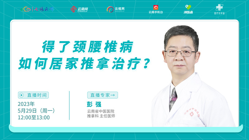 5月29日12:00至13:00,滇医通联合云南网进行视频直播《得了颈腰椎病,如何居家推拿治疗?》,邀请云南省中医医院推拿科主任医师彭强介绍颈腰椎病的居家疗法,以及推拿治疗的有关知识。