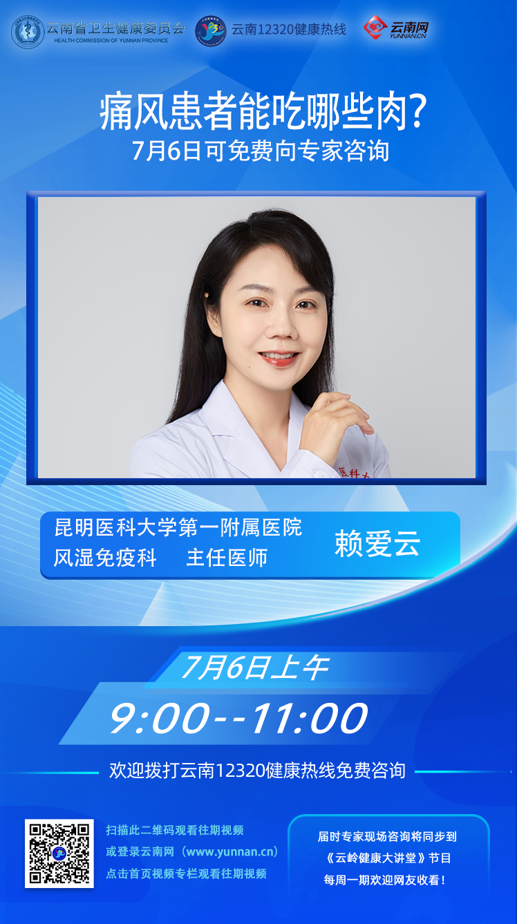 云南网讯(记者 习元喜 实习生 张国禾 宋佳佳)为何饮酒后痛风易发作?痛风患者应如何运动?痛风患者如何选择动物性食品?7月6日,昆明医科大学第一附属医院风湿免疫科主任医师赖爱云将做客云南12320健康热线,接听观众来电,免费为大家提供痛风性关节炎相关问题的咨询。同时还将接受云南网采访,为观众讲解痛风性关节炎的注意事项。欢迎大家拨打12320健康热线。