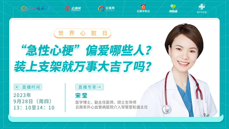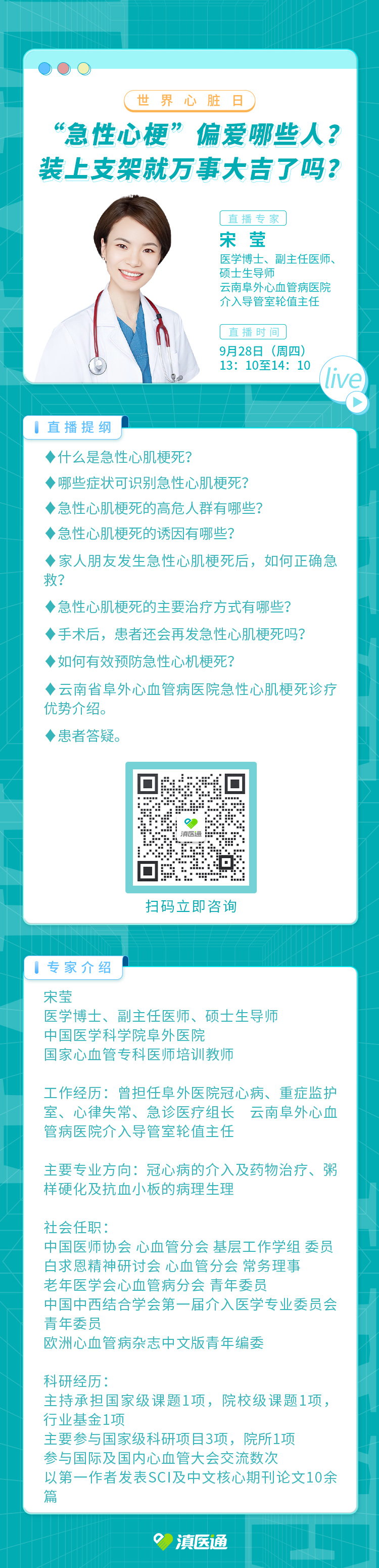 9月28日13:10至14:10,滇医通联合云南网进行视频直播《“急性心梗”偏爱哪些人?装上支架就万事大吉了吗?》,邀请云南阜外心血管病医院专家线上解答。