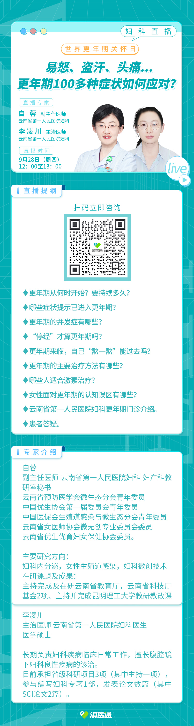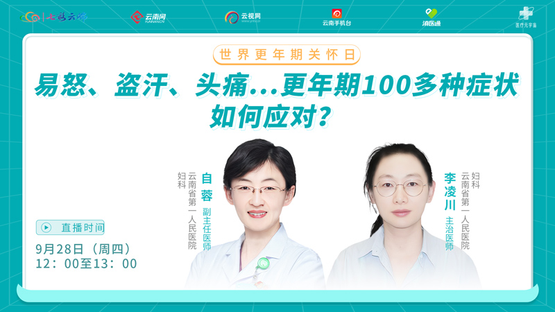 9月28日12:00至13:00,滇医通联合云南网进行视频直播《更年期100多种症状如何应对?》,邀请云南省第一人民医院专家线上解答。