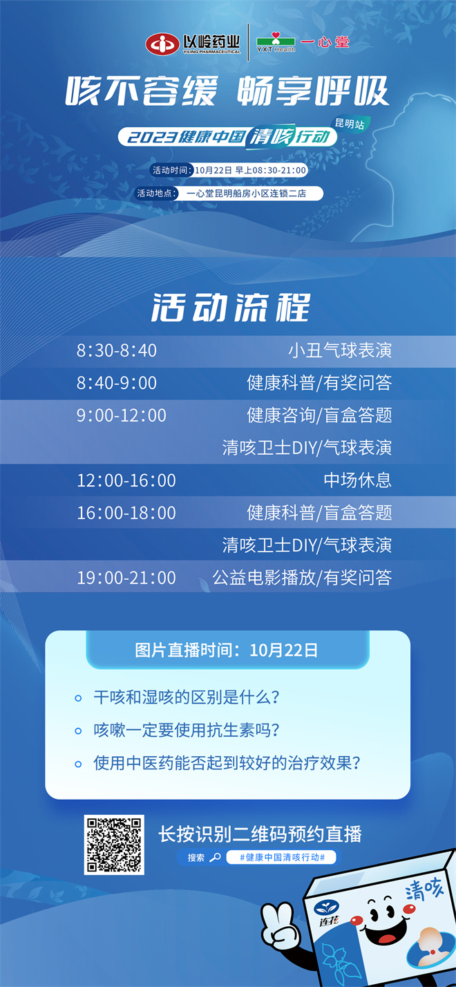 针对这一严峻的健康问题,除了加强个人防护,提升居民健康意识也尤为重要,10月22日,“咳不容缓 畅享呼吸”2023健康中国清咳行动将走进昆明,在一心堂昆明船房小区连锁二店为市民朋友们带来咳嗽知识科普讲座。活动现场还设置了有奖问答、盲盒答题和公益电影播放等活动,让市民在趣味活动中收获健康知识。