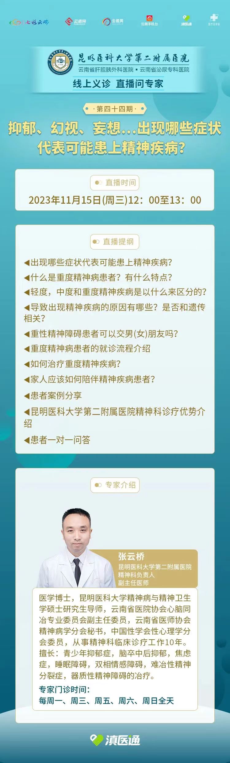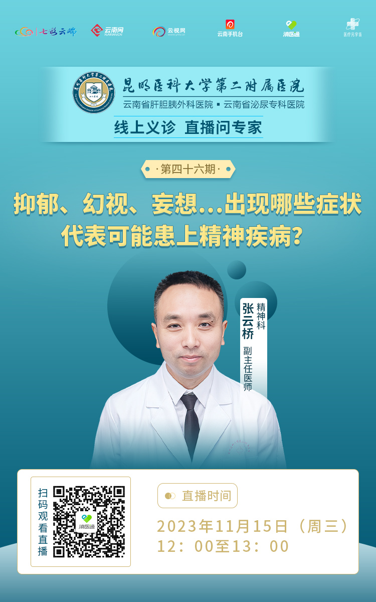 精神疾病有哪些表现?抑郁、幻视、妄想……当出现这些症状时,需要警惕精神疾病的发生。11月15日12:00-13:00,云南网联合滇医通邀请昆明医科大学第二附属医院精神科张云桥副主任医师做客直播间,欢迎扫码观看。