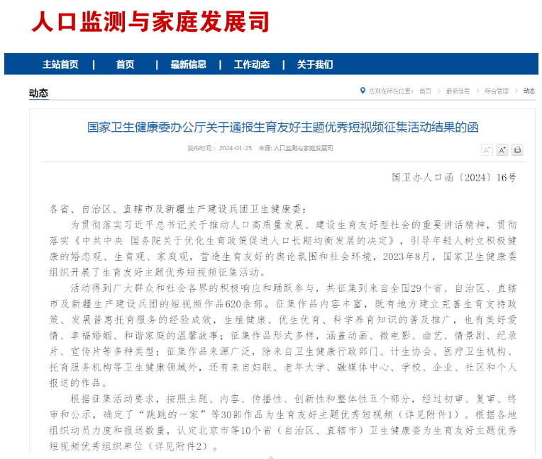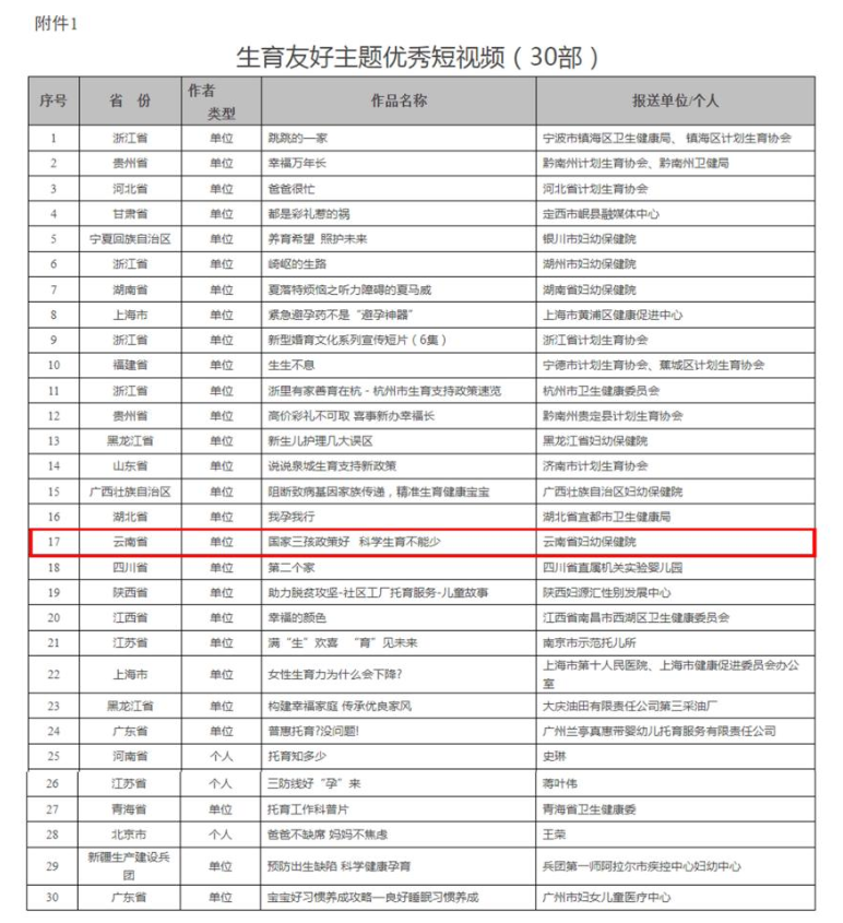 为贯彻落实习近平总书记关于推动人口高质量发展、建设生育友好型社会的重要讲话精神,引导年轻人树立积极健康的婚恋观、生育观、家庭观,营造生育友好的舆论氛围和社会环境,2023年8月,国家卫生健康委组织开展了生育友好主题优秀短视频征集活动。国家卫生健康委员会组织专家根据征集活动要求,按照主题、内容、传播性、创新性和整体性五个部分,经过初审、复审、终审和公示,近日,征集活动结果揭晓,从620余部征集作品中确定了30部为“生育友好主题优秀短视频”,云南省妇幼保健院创作报送的《国家三孩政策好,科学生育不能少》动漫科普视频从全国620余部作品中脱颖而出成功入选。