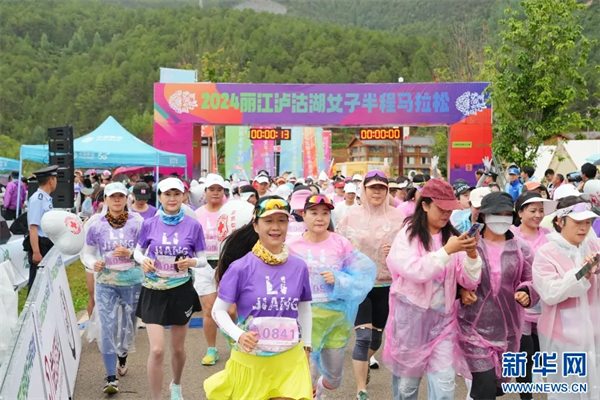 2024丽江泸沽湖女子半程马拉松于6月30日在云南省丽江市宁蒗彝族自治县泸沽湖畔鸣枪起跑,参赛者们在比赛中体验着“旅游+体育”的独特魅力。
