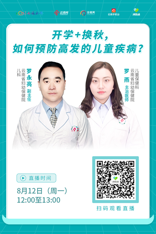 “开学+换秋”,如何预防高发的儿童疾病?8月12日(星期一)12:00至13:00,云南省妇幼保健院专家走进直播间,为您解答。