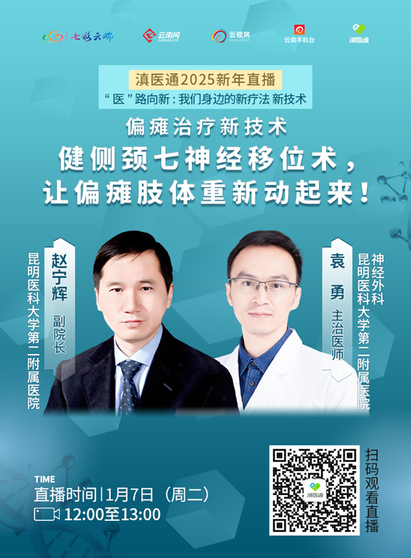偏瘫又称半身不遂,是身体一侧上下肢体的运动减弱或丧失而造成的功能障碍。偏瘫有哪些症状?常见病因是什么?健侧颈七神经移位术的原理是什么?健侧颈七神经移位术适合哪些患者?1月7日(周二)12:00至13:00,专家走进直播间为您解答。