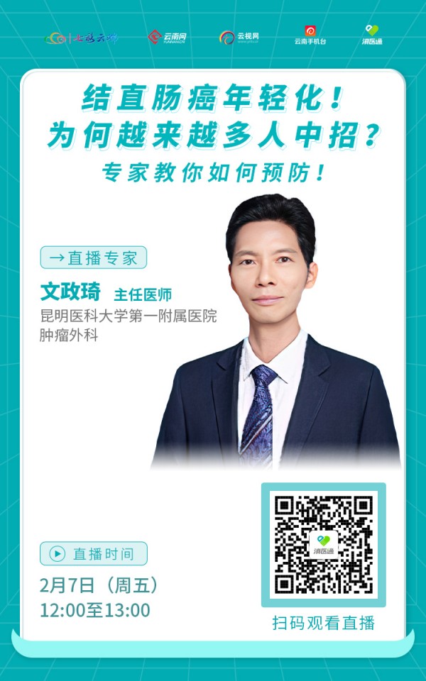 结直肠癌的高发人群是哪些?为何越发年轻化?结直肠癌的早期症状是什么?结直肠癌的主要发病原因有哪些?2月7日(周五)12:00至13:00,昆明医科大学第一附属医院专家做客直播间为您解答。