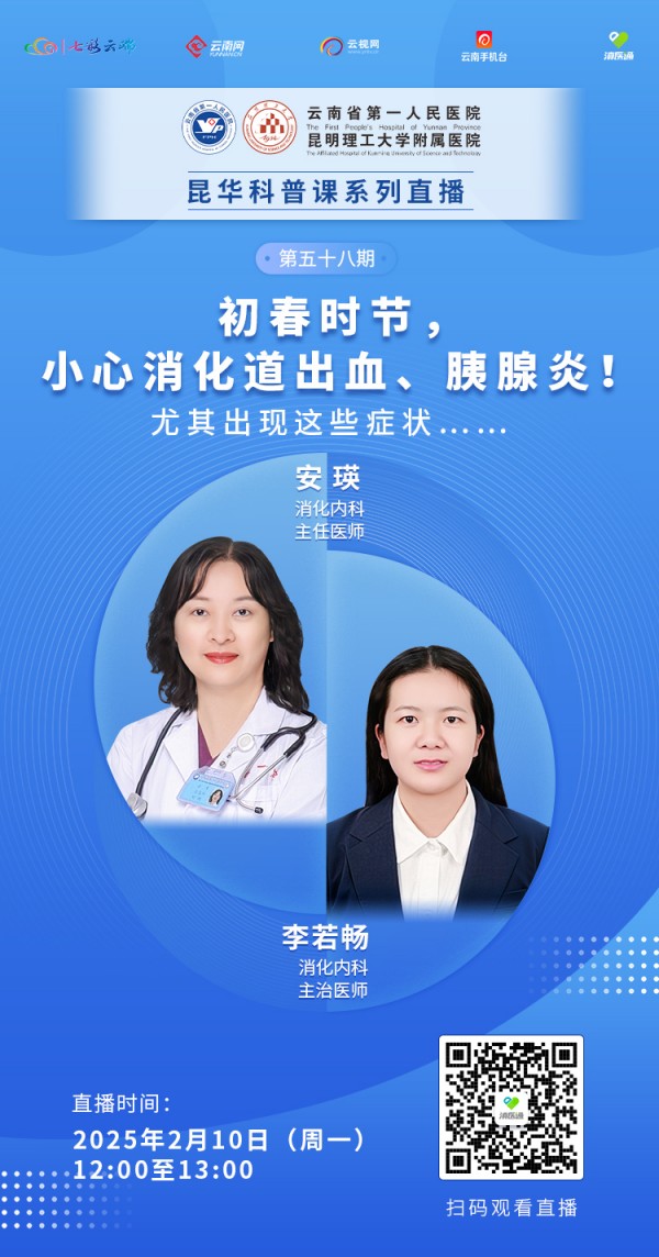 消化道出血的常见原因有哪些,为什么在初春时节多发?消化道出血有哪些症状?急性胰腺炎的诱因有哪些?急性胰腺炎治疗方法有哪些?2月10日(周一)12:00至13:00,云南省第一人民医院专家做客直播间为您解答。