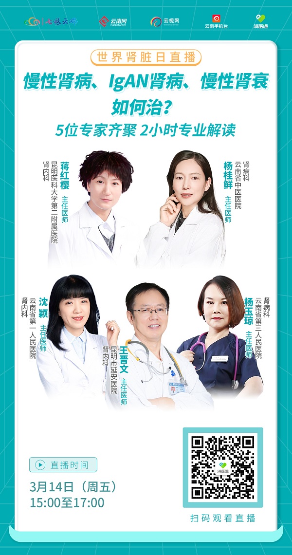 慢性肾衰如何治?3月14日15:00至17:00,5位专家齐聚滇医通直播间,为您答疑解惑,欢迎扫码观看。
