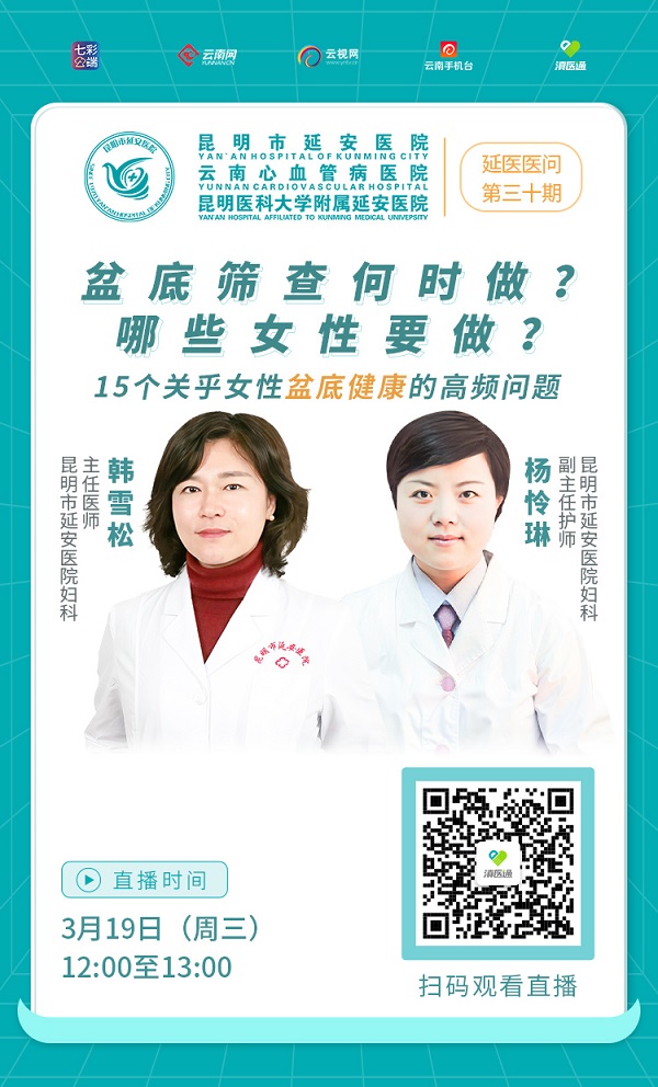 什么年龄段的女性需要做盆底疾病筛查?盆底疾病筛查具体包括哪些项目?常见的盆底疾病有哪些?每种疾病对生活有什么影响?3月19日12:00至13:00,昆明市延安医院妇科韩雪松主任医师及团队做客滇医通直播间,欢迎扫码观看。