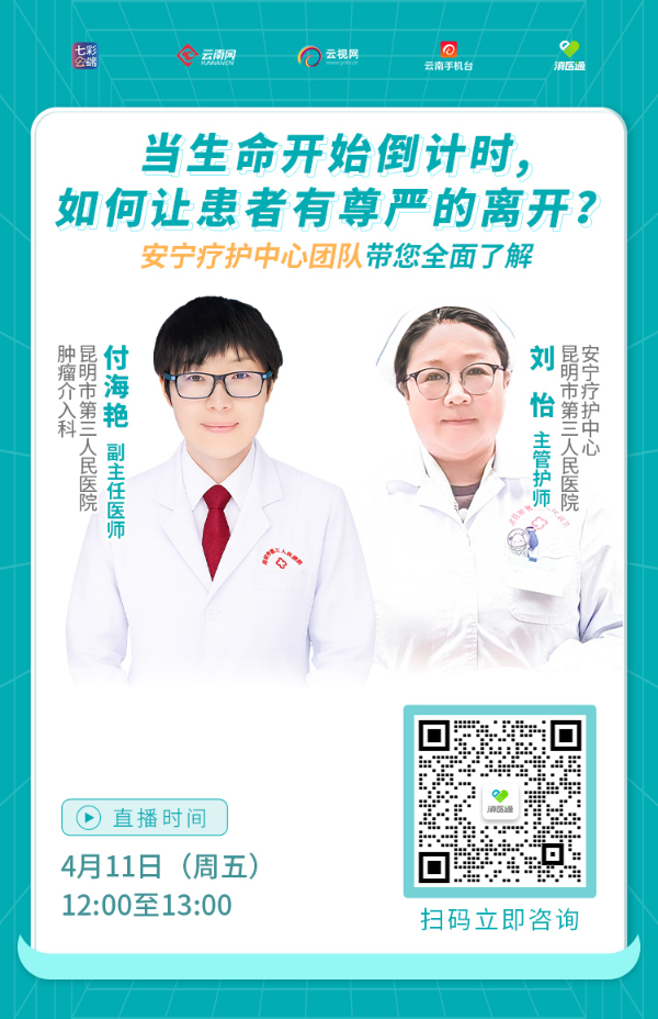 当生命开始倒计时如何让患者有尊严的离开?4月11日12:00至13:00,安宁疗护中心团队做客滇医通直播间,欢迎扫码观看。