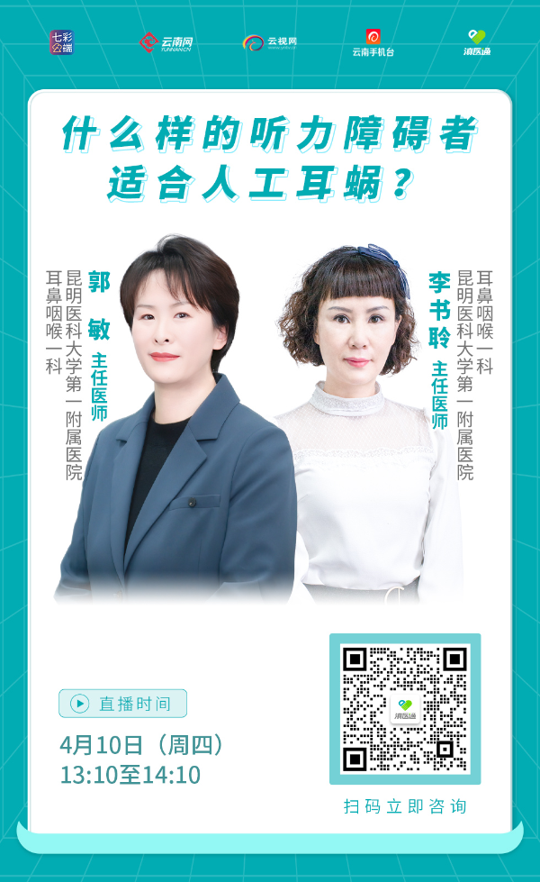 什么样的听力障碍者适合人工耳蜗?4月10日13:10至14:10,昆明医科大学第一附属医院耳鼻咽喉一科主任医师郭敏、李书聆做客滇医通直播间为您解答,欢迎扫码观看。