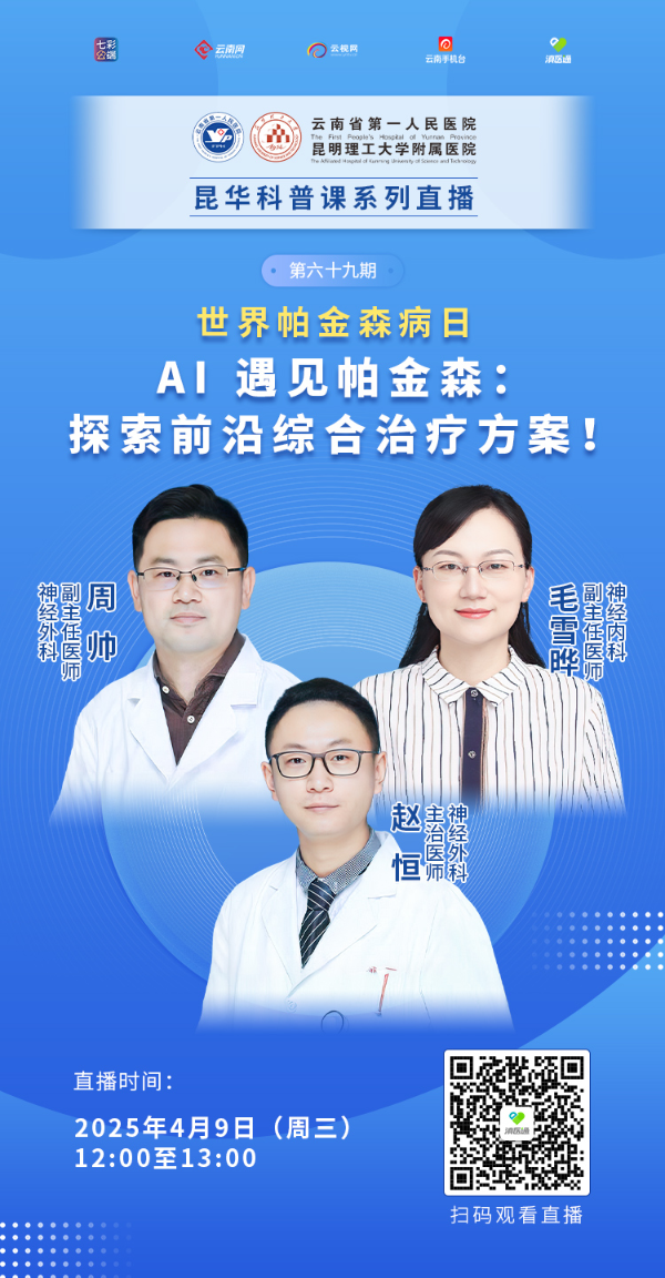 世界帕金森病日。AI遇见帕金森:探索前沿综合治疗方案!4月9日12:00至13:00,云南省第一人民医院、昆明理工大学附属医院专家做客滇医通直播间,欢迎扫码观看。