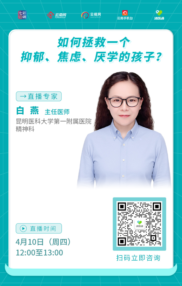 如何拯救一个抑郁、焦虑、厌学的孩子?4月10日12:00至13:00,昆明医科大学第一附属医院精神科主任医师白燕做客滇医通直播间为您解答,欢迎扫码观看。