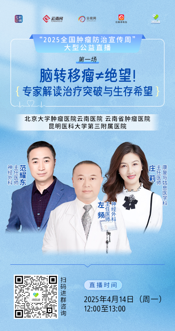 “2025全国肿瘤防治宣传周”大型公益直播第一场——脑转移瘤≠绝望!专家解读治疗突破与生存希望。4月14日12:00至13:00,北京大学肿瘤医院云南医院 云南省肿瘤医院 昆明医科大学第三附属医院专家做客滇医通直播间为您解答,欢迎扫码观看。