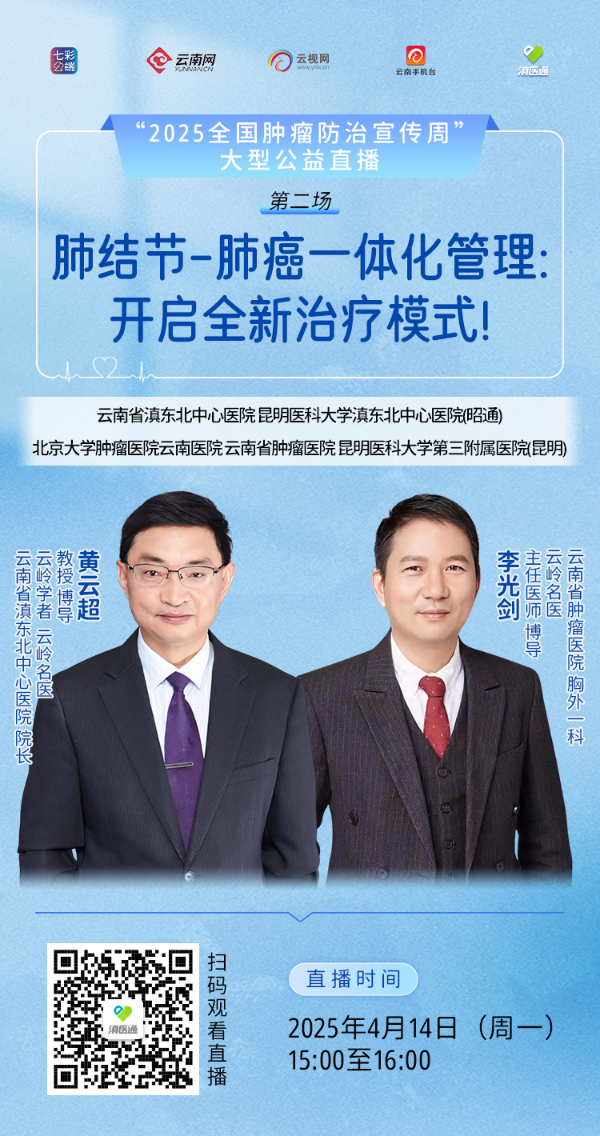 “2025全国肿瘤防治宣传周”大型公益直播第二场——肺结节-肺癌一体化管理:开启全新治疗模式!4月14日15:00至16:00,云南省滇东北中心医院 昆明医科大学滇东北中心医院(昭通)、北京大学肿瘤医院云南医院 云南省肿瘤医院 昆明医科大学第三附属医院(昆明)专家做客滇医通直播间为您解答,欢迎扫码观看。