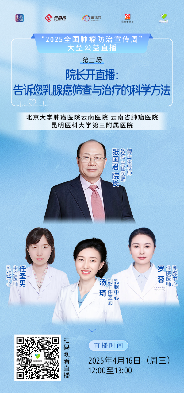 “2025全国肿瘤防治宣传周”大型公益直播第三场——院长开直播:告诉您乳腺癌筛查与治疗的科学方法。4月16日12:00至13:00,北京大学肿瘤医院云南医院 云南省肿瘤医院 昆明医科大学第三附属医院专家做客滇医通直播间为您解答,欢迎扫码观看。