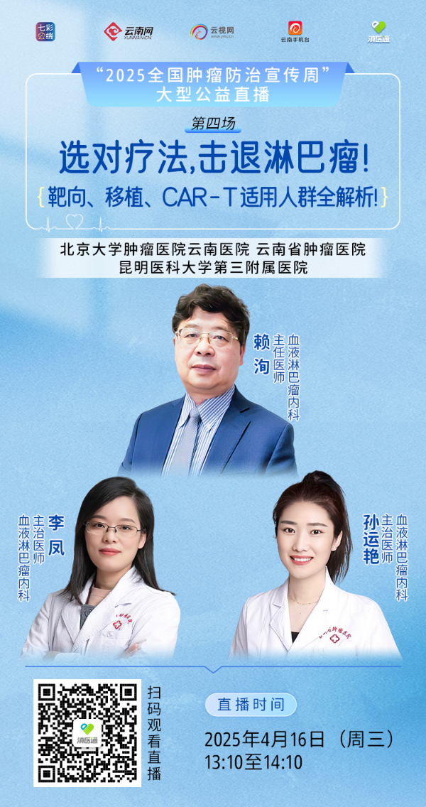 “2025全国肿瘤防治宣传周”大型公益直播第四场——选对疗法,击退淋巴瘤!靶向、移植、CAR-T适用人群全解析!4月16日13:10至14:10,北京大学肿瘤医院云南医院 云南省肿瘤医院 昆明医科大学第三附属医院专家做客滇医通直播间为您解答,欢迎扫码观看。