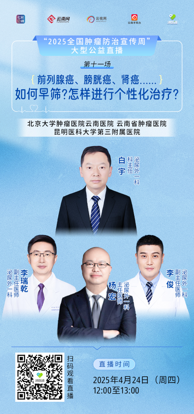“2025全国肿瘤防治宣传周”大型公益直播第十一场——前列腺癌、膀胱癌、肾癌……如何早筛?怎样进行个性化治疗?将于4月24日12:00至13:00开播,北京大学肿瘤医院云南医院 云南省肿瘤医院 昆明医科大学第三附属医院专家做客滇医通直播间为您解答,欢迎扫码观看。