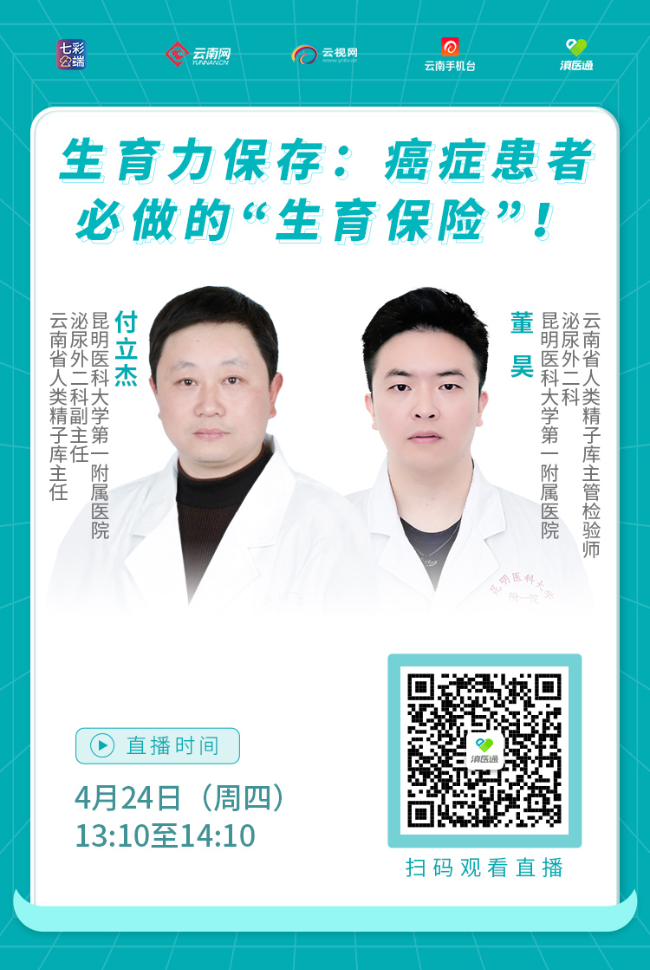 生育力保存:癌症患者必做的“生育保险”!4月24日13:10至14:10,昆明医科大学第一附属医院泌尿外二科专家做客滇医通直播间为您解答,欢迎扫码观看。