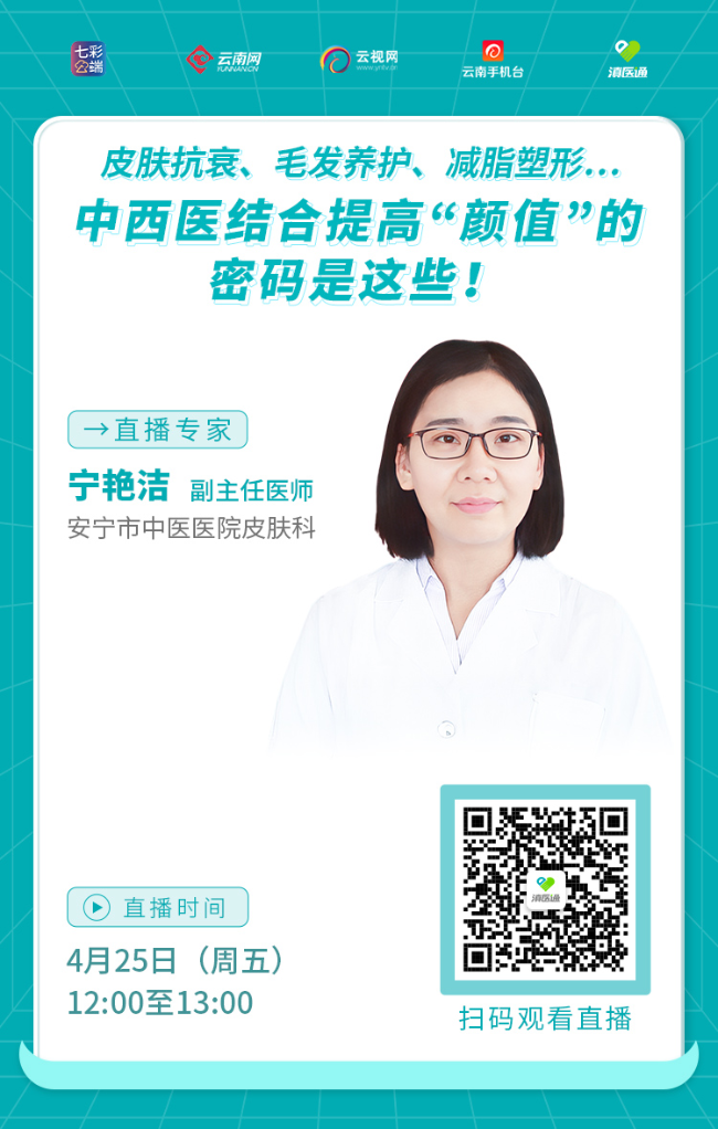 皮肤抗衰、毛发养护、减脂塑性……中西医结合提高“颜值”的密码是这些!4月25日12:00至13:00,安宁市中医医院皮肤科专家做客