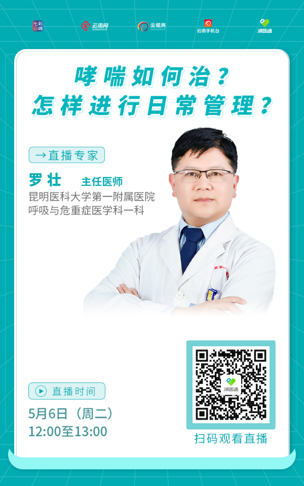 哮喘如何治?怎样进行日常管理?5月6日(周二)12:00至13:00,昆明医科大学第一附属医院专家做客滇医通直播间为您解答,欢迎扫码观看。