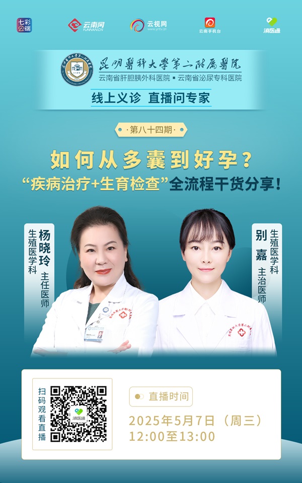 如何从多囊到好孕?“疾病治疗+生育检查”全流程干货分享!5月7日(周三)12:00至13:00,昆明医科大学第二附属医院(云南省泌尿专科医院、云南省肝胆胰外科医院)专家做客滇医通直播间为您解答,欢迎扫码观看。