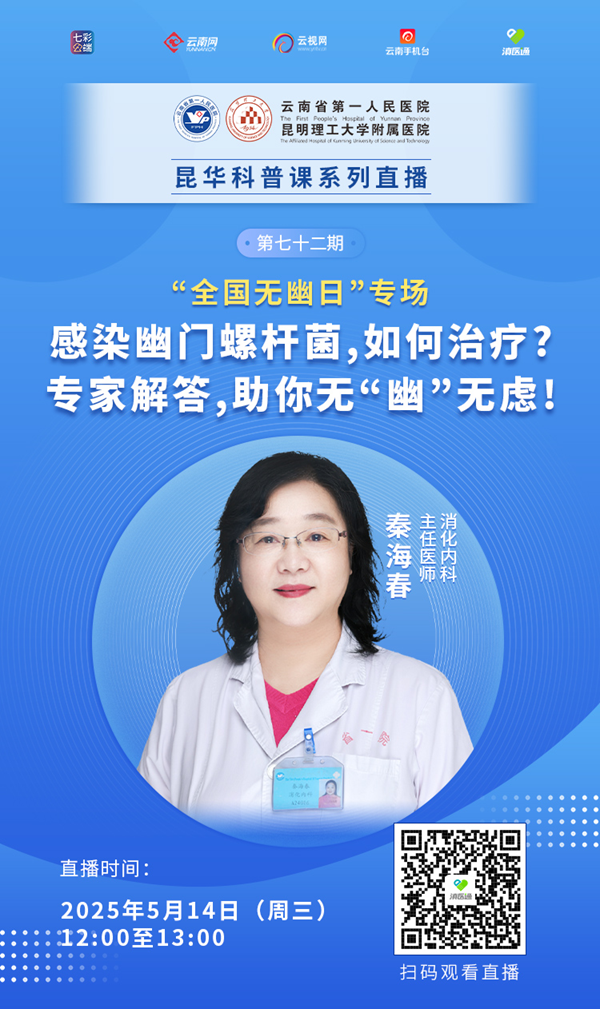 感染幽门螺杆菌如何治疗?专家解答,助你无“幽”无虑!5月14日(周三)12:00至13:30,云南省第一人民医院专家做客滇医通直播间为您解答,欢迎扫码观看。