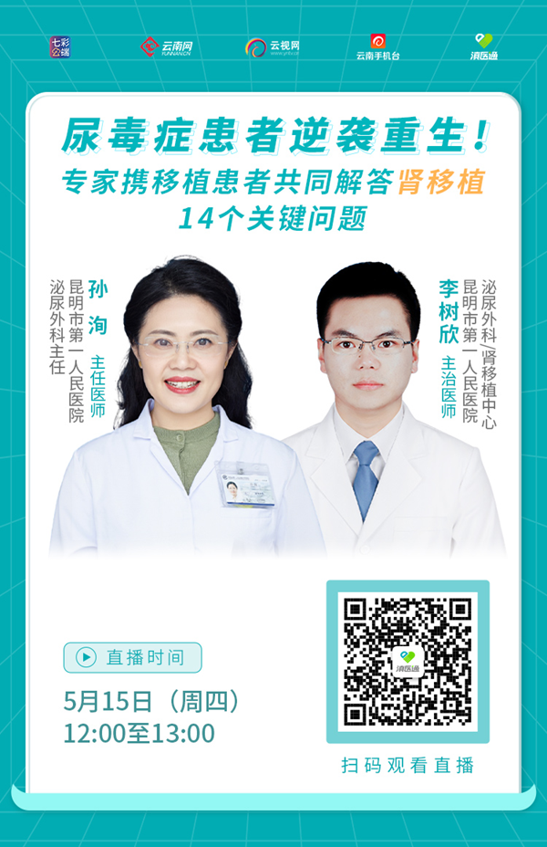 尿毒症如何治疗,肾移植手术为无数患者开启新生!5月15日(周四)12:00—13:00,昆明市第一人民医院专家做客滇医通直播间为您解答,欢迎扫码观看。