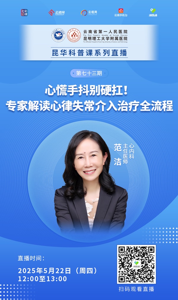 心慌手抖别硬扛!5月22日(周四)12:00—13:00,云南省第一人民医院专家做客滇医通直播间,解读心律失常介入治疗全流程,欢迎扫码观看。