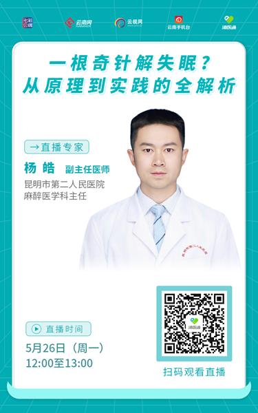 星状神经节阻滞的适应症有哪些?治疗后多久能看到效果?需要持续治疗多久?该疗法对不同年龄段(如老年人、年轻人)失眠患者的疗效是否存在差异?原因是什么?5月26日12:00至13:00,昆明市第二人民医院专家做客滇医通直播间,欢迎扫码观看。