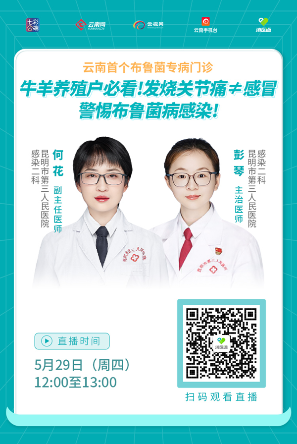 牛羊养殖户必看!发烧关节痛≠感冒,要警惕布鲁菌病感染!5月29日(周四)12:00—13:00,昆明市第三人民医院专家做客滇医通直播间,为您解答,欢迎扫码观看。