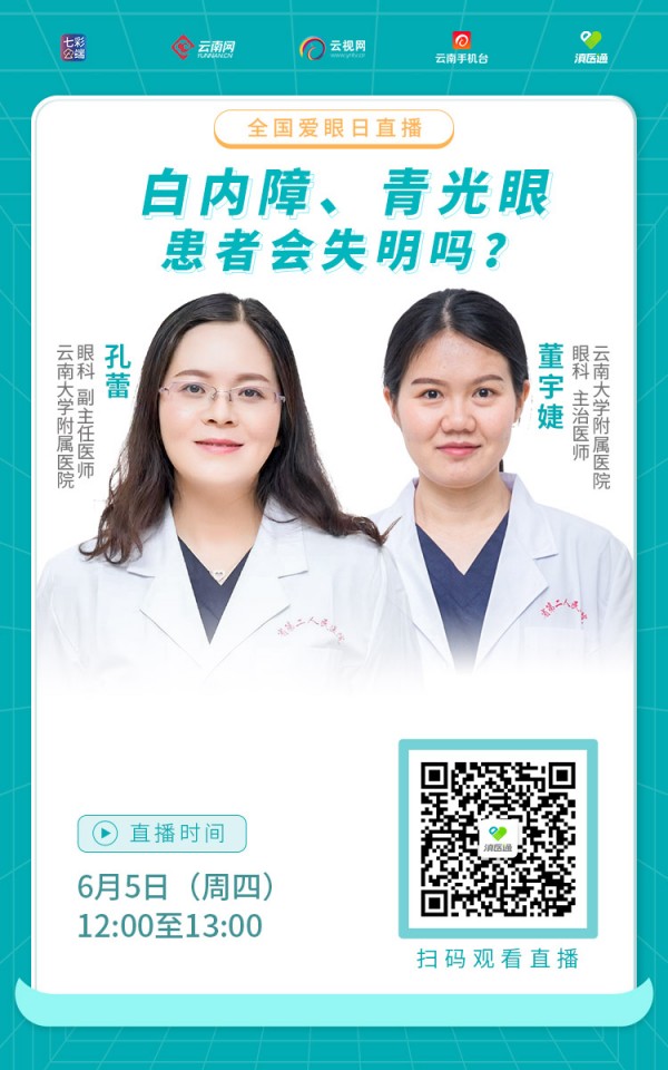 白内障是老年人的专属病吗?年轻人会得吗?每天关灯玩手机会得青光眼吗?白内障和青光眼会导致失明吗?6月5日(周四)12:00至13:00,云南大学附属医院专家做客直播间为您解答。