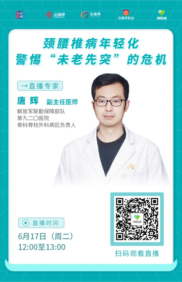 颈椎病的早、中、后期表现是什么?颈椎病的危害是什么?什么人容易患上腰椎间盘突出?哪种颈椎腰椎疼痛提示需要尽快就医?6月17日(周二)12:00至13:00,解放军联勤保障部队第九二〇医院专家做客直播间为您解答。