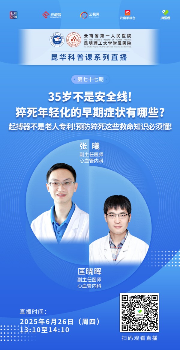 近年来中青年猝死事件频发,哪些容易被忽视的“身体警报”(如短暂胸痛、莫名乏力)最需警惕?熬夜加班族长期熬夜后出现心慌、头晕,是疲劳还是猝死前兆?如何区分?6月26日(周四)13:10至14:10,云南省第一人民医院专家做客直播间为您解答。