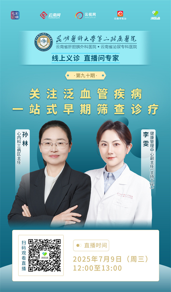关注泛血管疾病,一站式早期筛查诊疗。7月19日(周三)12:00至13:00,昆明医科大学第二附属医院专家做客直播间为您解答。