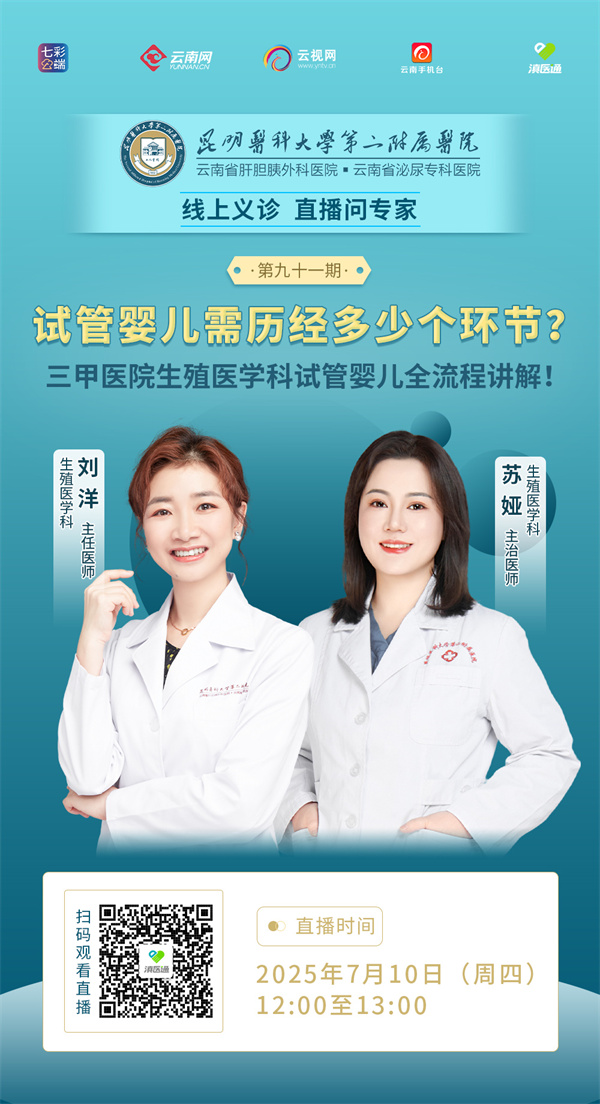 试管婴儿需历经多少个环节?三甲医院生殖医学科试管婴儿全流程讲解!7月10日(周四)12:00至13:00,昆明医科大学第二附属医院专家做客直播间为您解答。
