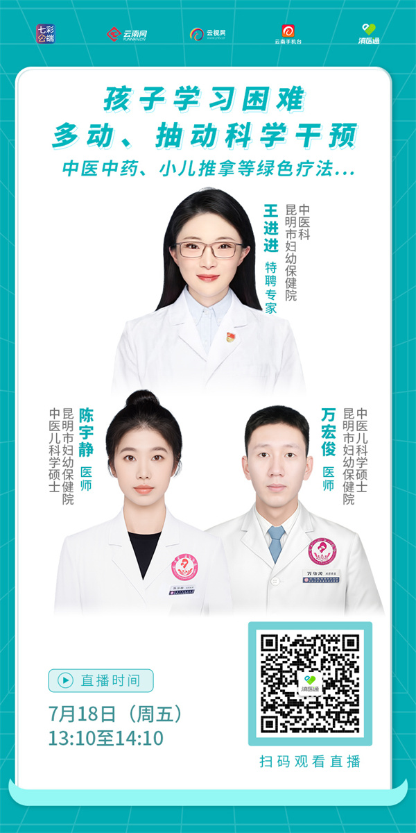 孩子学习困难多动、抽动科学干预!7月18日(周五)13:10至14:10,昆明市妇幼保健院专家做客直播间为您解答。