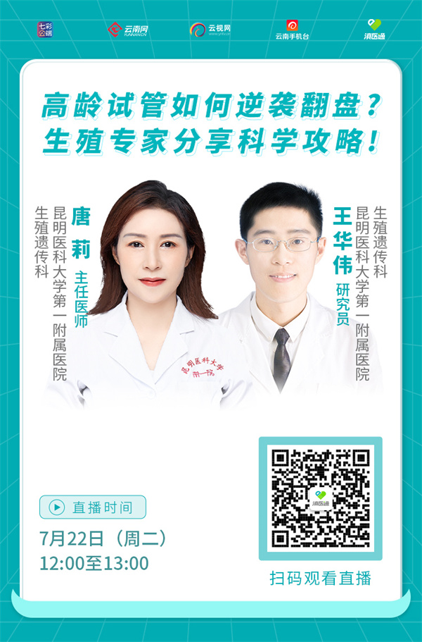 高龄试管如何逆装翻盘?生殖专家分享科学攻略!7月22日(周二)12:00至13:00,昆明医科大学第一附属医院专家做客直播间为您解答。