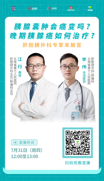 胰腺囊肿会癌变吗?晚期胰腺癌如何治疗?7月31日(周四)12:00至13:00,云南省第三人民医院专家做客直播间为您解答。
