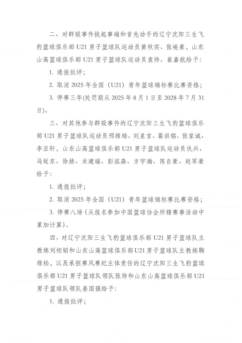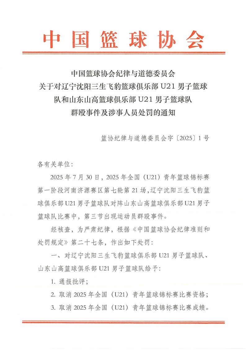 据中国篮球协会官网消息,8月1日,中国篮球协会纪律与道德委员会发布关于对辽宁沈阳三生飞豹篮球俱乐部U21男子篮球队和山东山高篮球俱乐部U21男子篮球队群殴事件及涉事人员处罚的通知,全文如下: