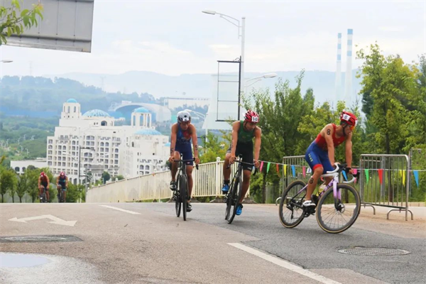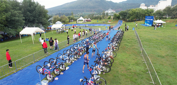 选手们在阳宗海的自然水面、环湖绿道和自行车赛道上进行游泳、跑步、骑行不同赛程的比拼。