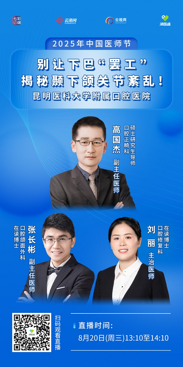 颞下颌关节紊乱,也叫颞下颌关节紊乱综合征,这是一种口腔颌面部常见疾病,主要是指涉及与颞下颌关节相关的结构之间的解剖和功能异常所引发的一类疾病的总称。哪些检查可以确诊?如何治疗?8月20日13:10至14:10,昆明医科大学附属口腔医院专家做客滇医通直播间,欢迎扫码观看。
