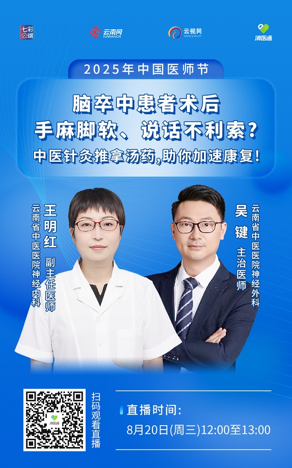 从中医理论看,脑卒中(中风)术后患者为什么会出现肢体麻木、无力或言语不清等症状?在脑卒中术后康复中,针灸是如何起作用的?它的核心治疗逻辑是什么?推拿在脑卒中术后康复中主要解决哪些问题?家属是否能自行给患者做推拿?如果想在家辅助,哪些轻柔手法是安全的?哪些动作绝对不能做?8月20日12:00至13:00,云南省中医医院神经内科王明红副主任医师及团队做客滇医通直播间,欢迎扫码观看。